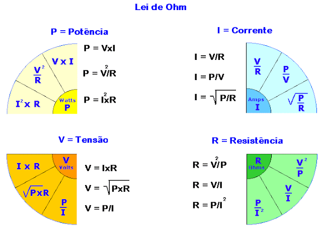 A próxima imagem tem as fórmulas separadas relativamente à potência, corrente, resistência, e tensão. Assim é mais fácil compreender a primeira imagem.